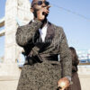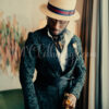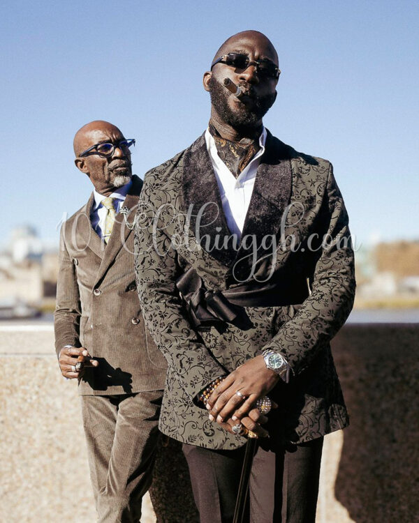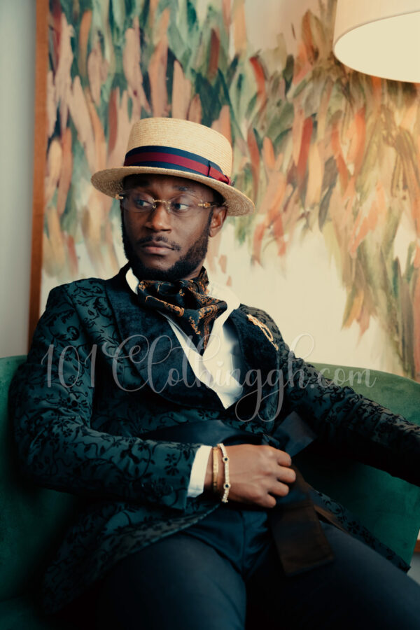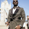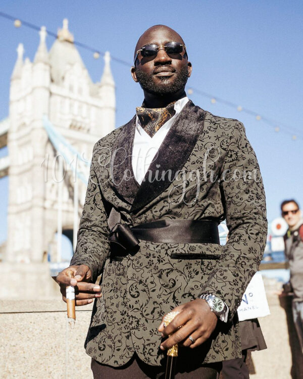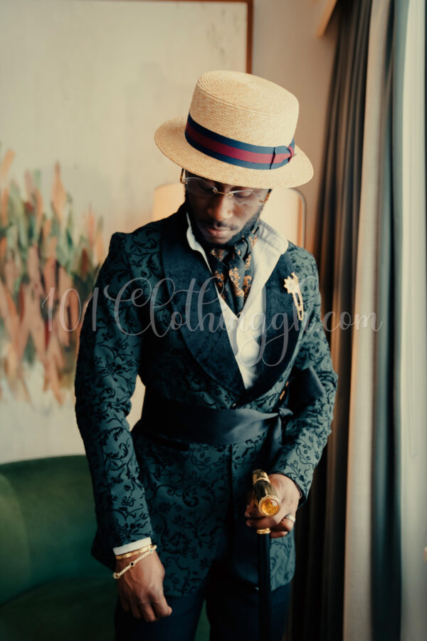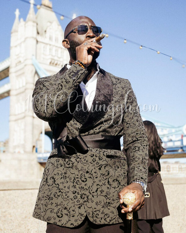 Slicker than your average, the Burnett navy green velvet jacket features a floral burn out pattern.