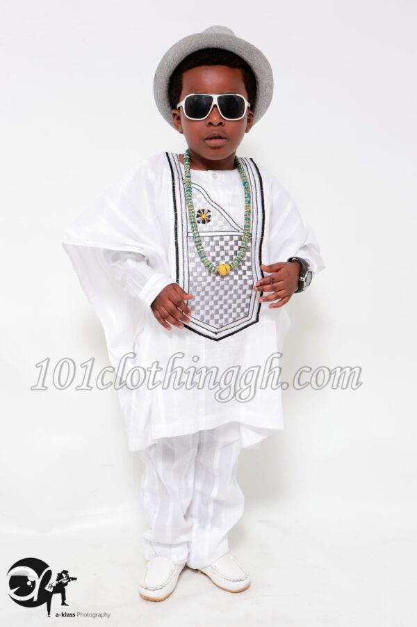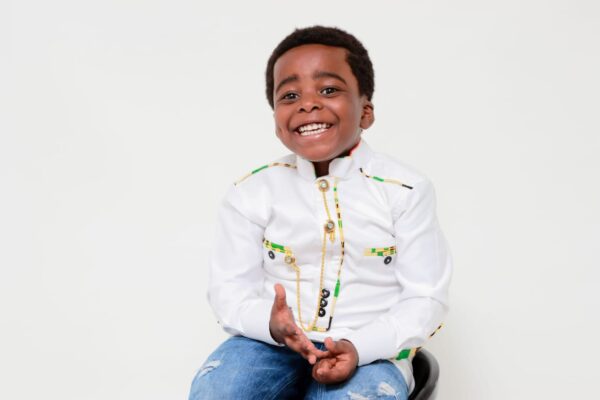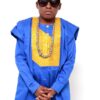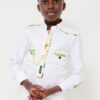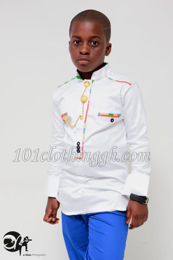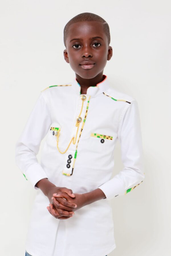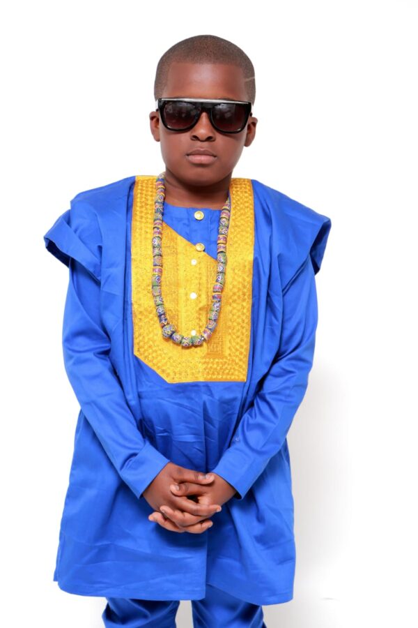 Let your little one shine in royal African kaftan. This vibrant African-inspired design features gold embroidery.